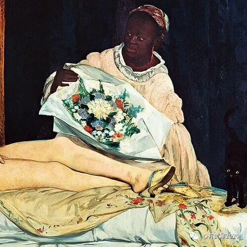 画面上一名慵懒的女子,侧卧在床榻上,说实话这女孩虽然有三分姿色,但就是太世俗化了,显得太平庸!旁边还有一个黑色的仆人手捧着一束鲜花,太黑了,脸型都显得很模糊,女孩脚边还有一只黑猫,两只猫头鹰一样的眼睛在黑暗中闪闪发光!黑猫、黑皮肤和女子裸体的白皮肤、白色的床单被褥形成了鲜明的对比!这位女子很大胆,正在肆无忌惮地打量着观赏者,有明显的挑逗神情!