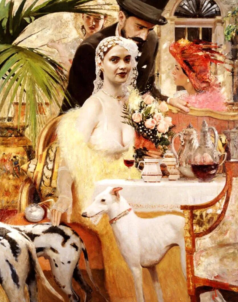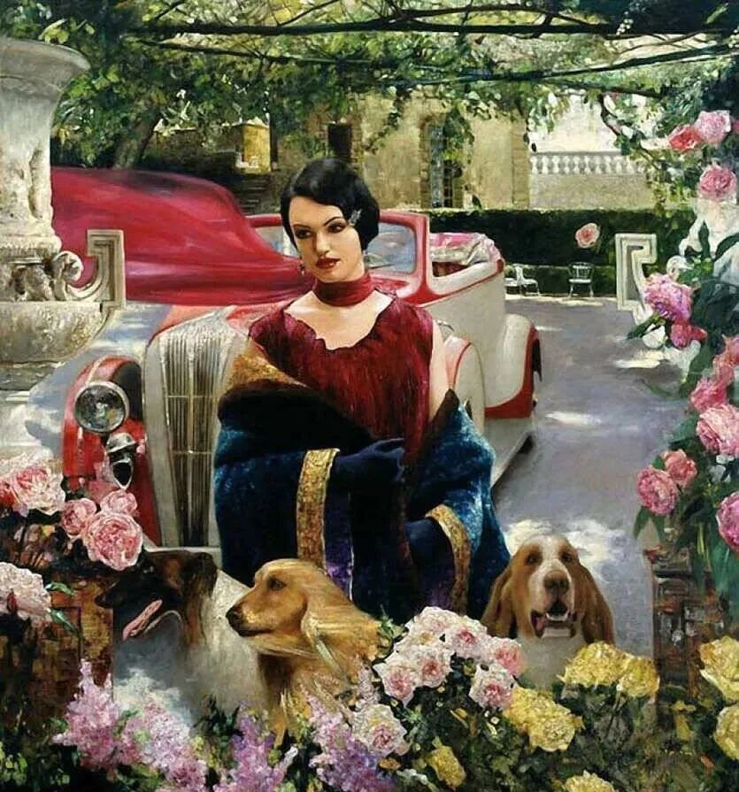 而且这位俄罗斯画家特别喜欢画狗,都是那种大型的犬类,跟随着女主人出入各种高档娱乐场所!也许是为了提升主人的社会地位吧,毕竟这种狗,一般家庭是养不起的!