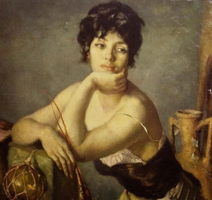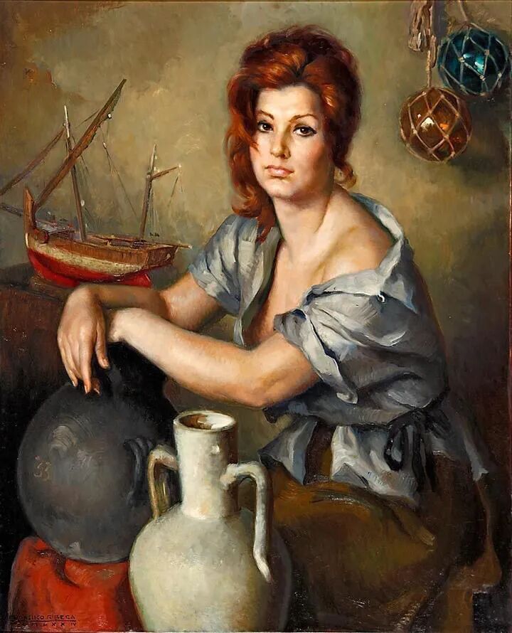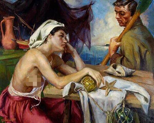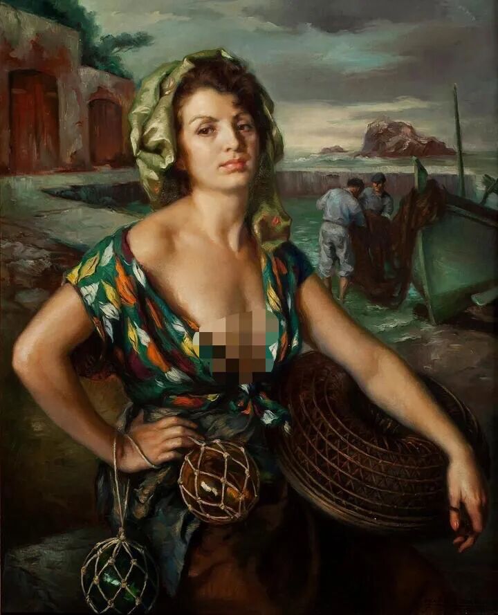 这是一幅以不远处渔民出海的小船,还有风云变幻莫测的天空为背景的作品,而画布前的这位女子,也许是某位出海渔民的妻子!从她一手叉腰,一手拿着一个鱼篓的姿态,和望向观者的神态,这就相当于一名闯荡江湖的女汉子了,有一种天不怕地不怕,任何风浪都吓不到我的心理素质!