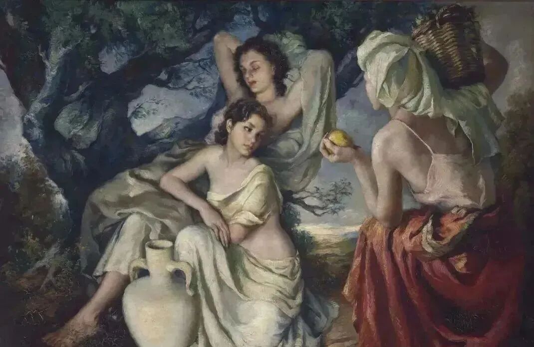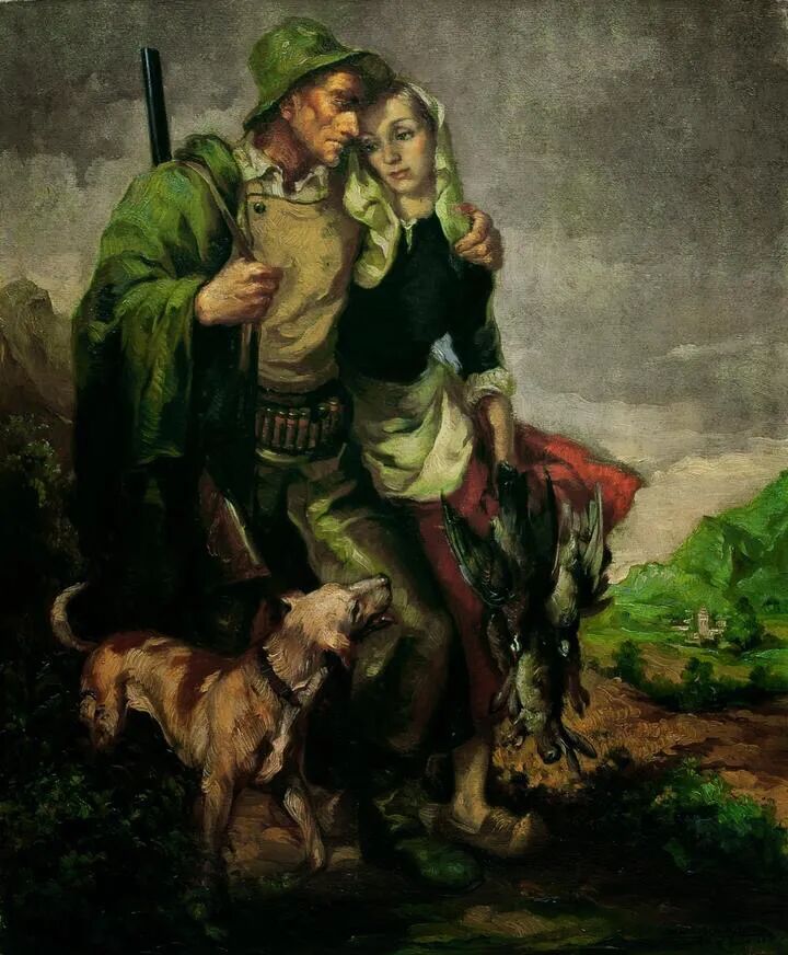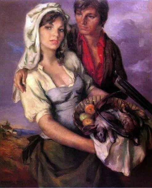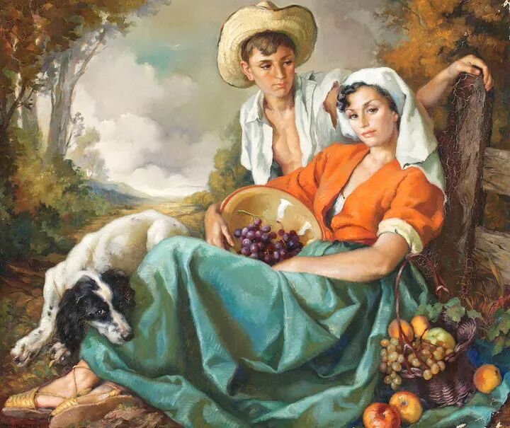 田园牧歌般的画面,浪漫而温馨!这对夫妻在果园里采摘了很多水果🥭,硕果累累,丰收的喜悦,心满意足的神态,还有一条忠诚的狗狗围绕着他们,此时此刻的幸福在画布上爆棚,也同样感染了观者!见到此画的人,一定也是一位幸运的人,因为好运会传染!