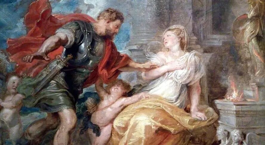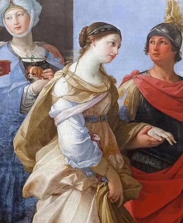 圭多·雷尼创作的《诱拐海伦》,其实也谈不上坑蒙拐骗,从画布上看起来海伦是心甘情愿跟随画中的这位年轻英俊的帅哥走的,你看她们手挽着手,多么和谐般配!跟她年老的丈夫相比,那简直是相差十万八千里!