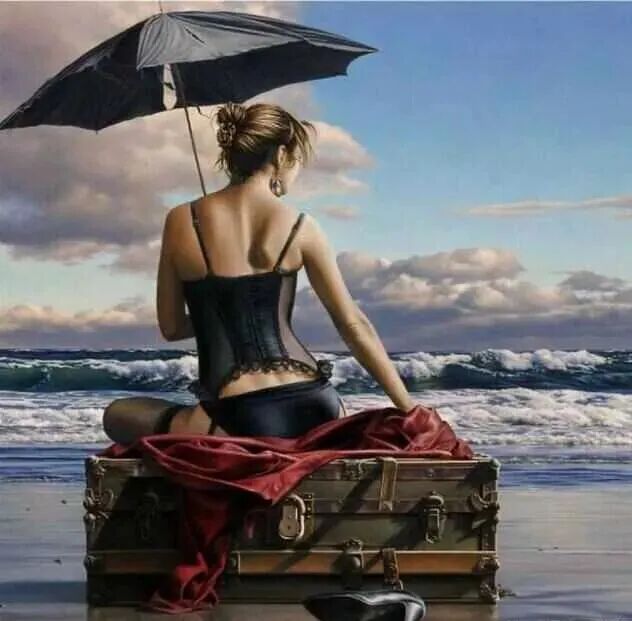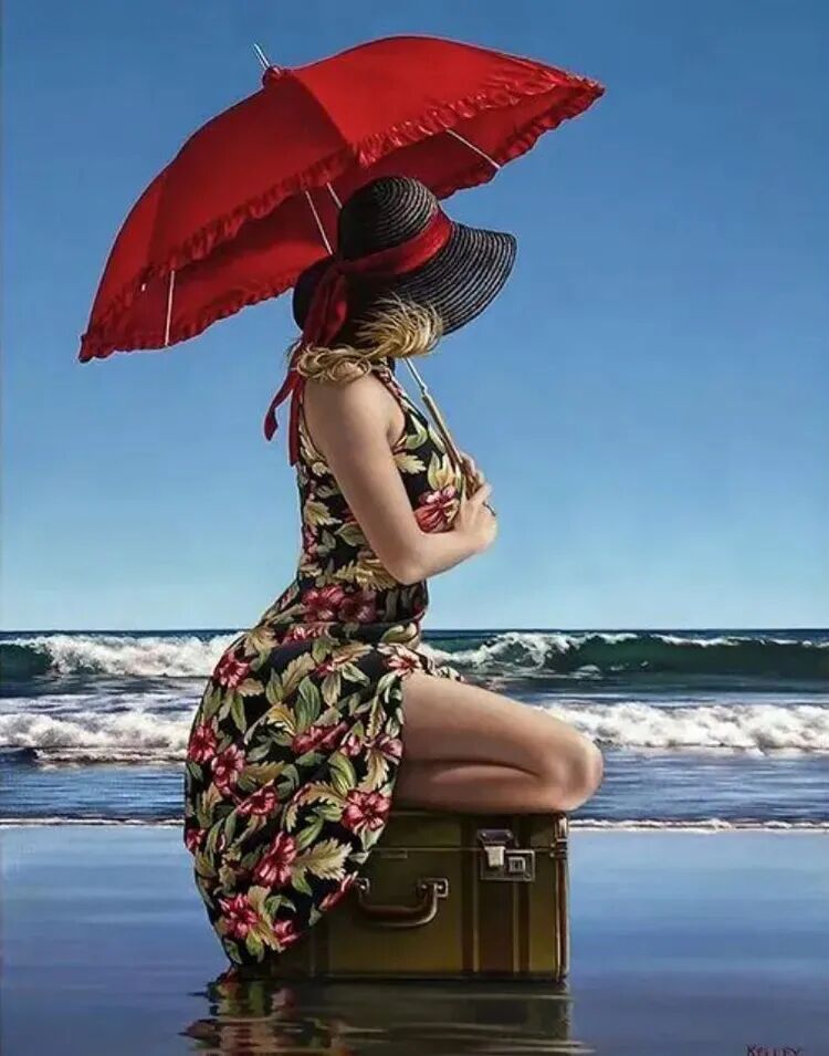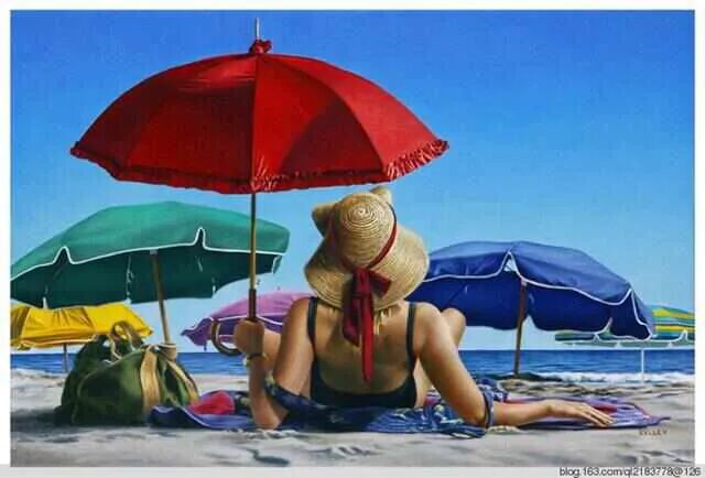 画家喜欢把人物安置于与天地同宽的环境和氛围里,让这些女模特们与大自然亲密无间融为一体!而这也是很多人喜欢来海滨度假旅游的原因,如果能把身心无牵无挂都融入到海天一色中,那才是真正的放松减压方式!
