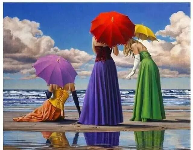 丽人倒影,分外妖娆,海天一色,一望无际,注意一下这三位女郎穿的裙子,还有三顶阳伞☂️,这颜色怎这么令人赏心悦目!这曼妙的迷人的身姿,就如天边的蓝天白云晴空万里,令人心动难忘……