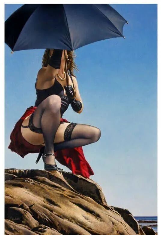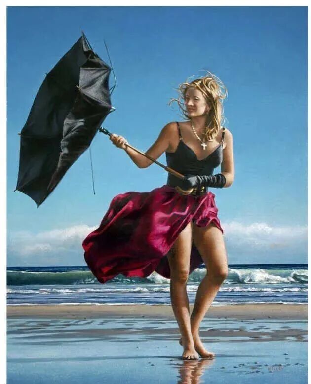 海风太大了,遮阳伞都吹喇叭了,搏击风浪的考验,其实和现实生活一样!当然画家其实只是利用这阵巨大的海风,来刻画这位女子的曼妙曲线,这也是吸晴创作的一种方式!