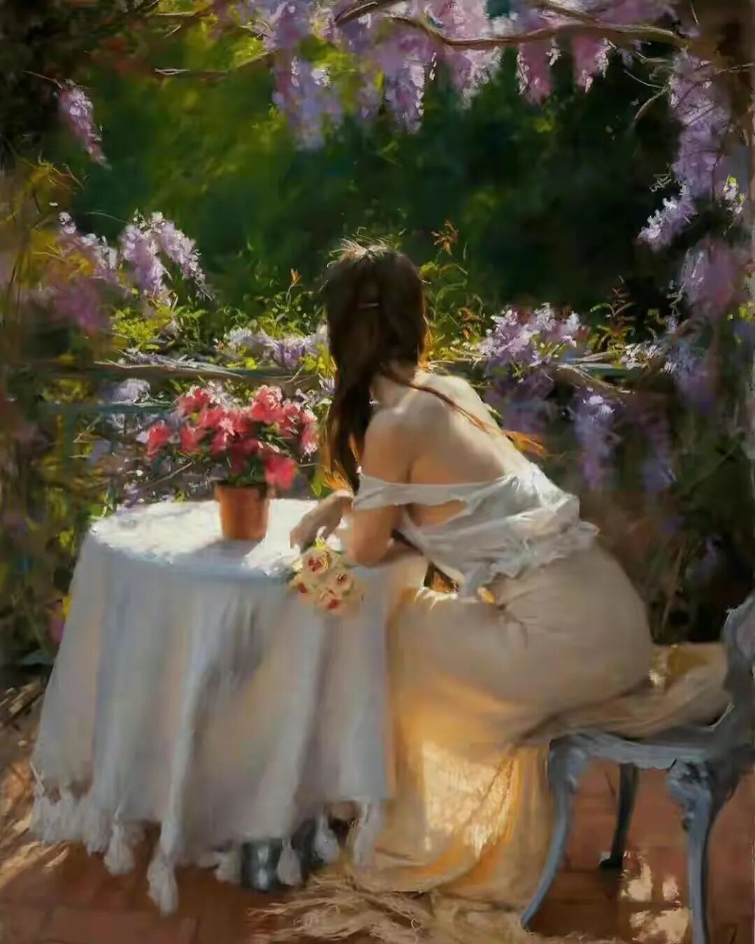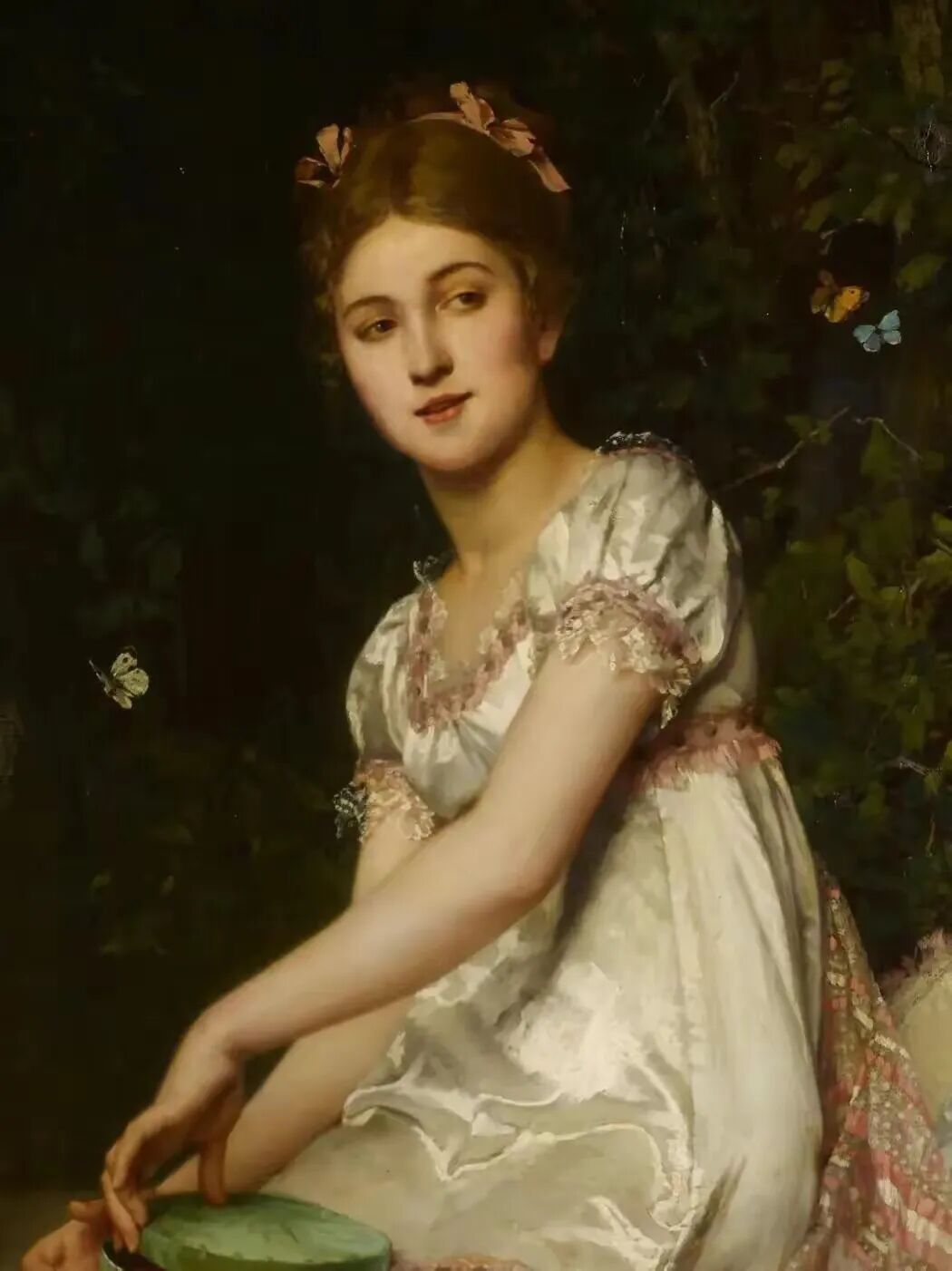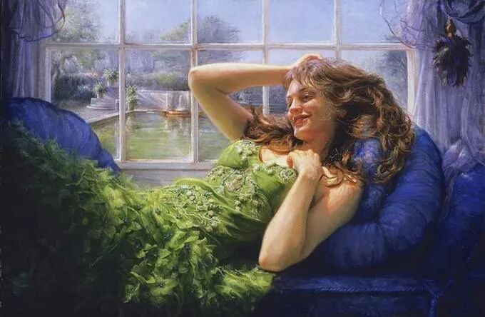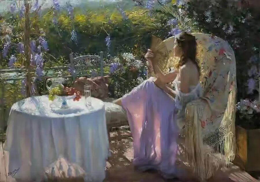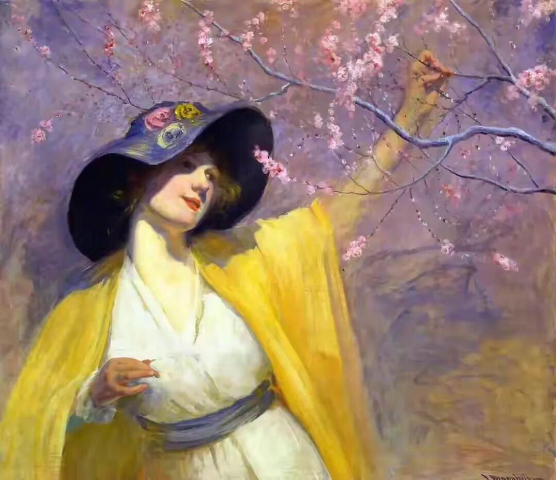 欣赏这幅画,从眼前翩跹而过,一下子就感受到了一种快乐的气息!画布上的女子明眸皓齿,巧笑倩兮,带着春天的脚步,一下子走入了观者的心扉!