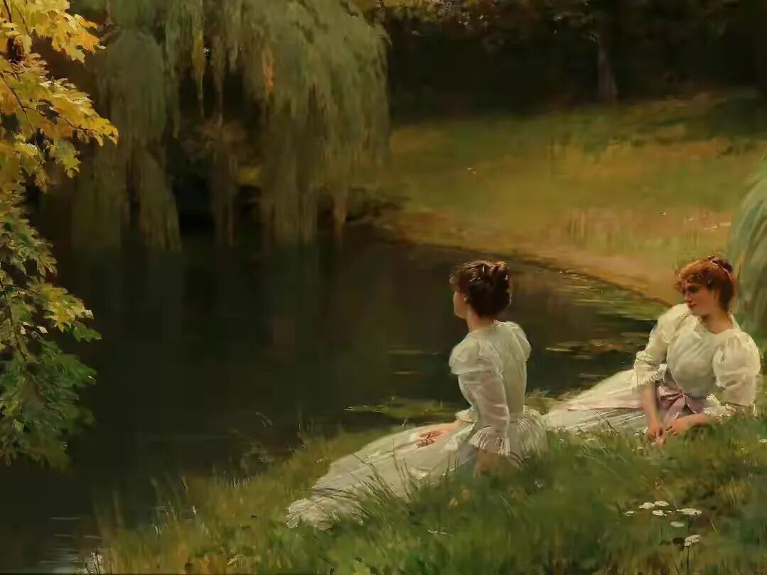江南的春天,小桥流水,桃红柳绿,草木葱茏,水波荡漾,两位佳人临水而依,另一位佳人在折一朵红梅!画家刻画了她柔软的腰肢,含情脉脉的媚态!