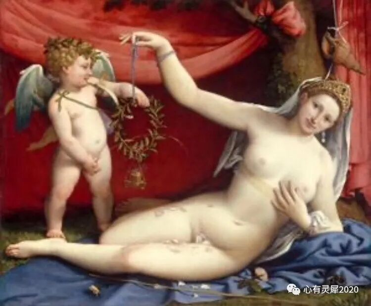 《维纳斯与丘比特》,这幅虽是希腊神话,却洋溢着世俗的肉体气息!维纳斯裸体侧卧于塌上,丘比特正与母亲嬉戏玩耍,充满了人间烟火的欢乐气氛!