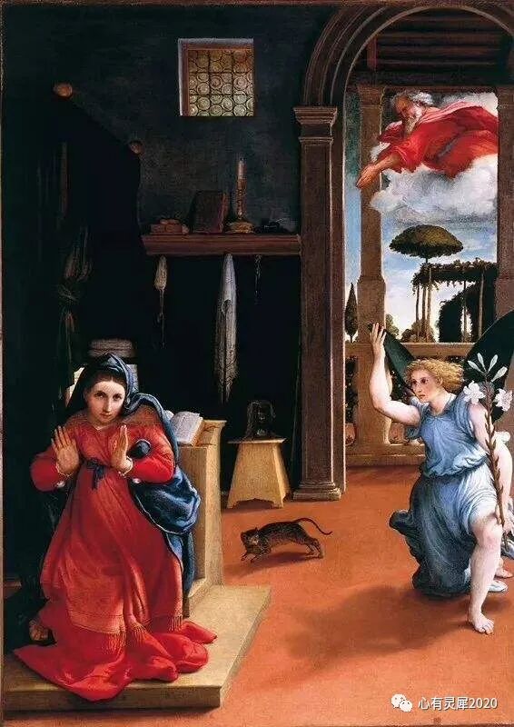 这幅是《受胎告知》,画面上天使急匆匆地来传达上帝的旨意,而童真少女玛利亚却被突如其来的消息给吓到了,眼神恐惧,双手作拒绝的姿势!地上的一只猫也被吓到了,正想逃走,云端里的上帝也正用手指着玛利亚,三个人和猫,互相对应着,场面非常具有戏剧性!