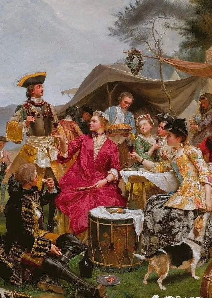 这幅作品取名《欢迎》,画面上一名军官气宇轩昂从战场得胜,凯旋而归,他的朋友们正举杯为他庆祝,热烈而隆重,而画中人物华丽精美的服饰更是渲染了当时欢迎的气氛和心情!2007年10月23日,这幅画作在纽约苏富比以361,000美元的价格成交,当时的很多艺术家认为,此幅画作可与华托等大画家最杰出的作品媲美!