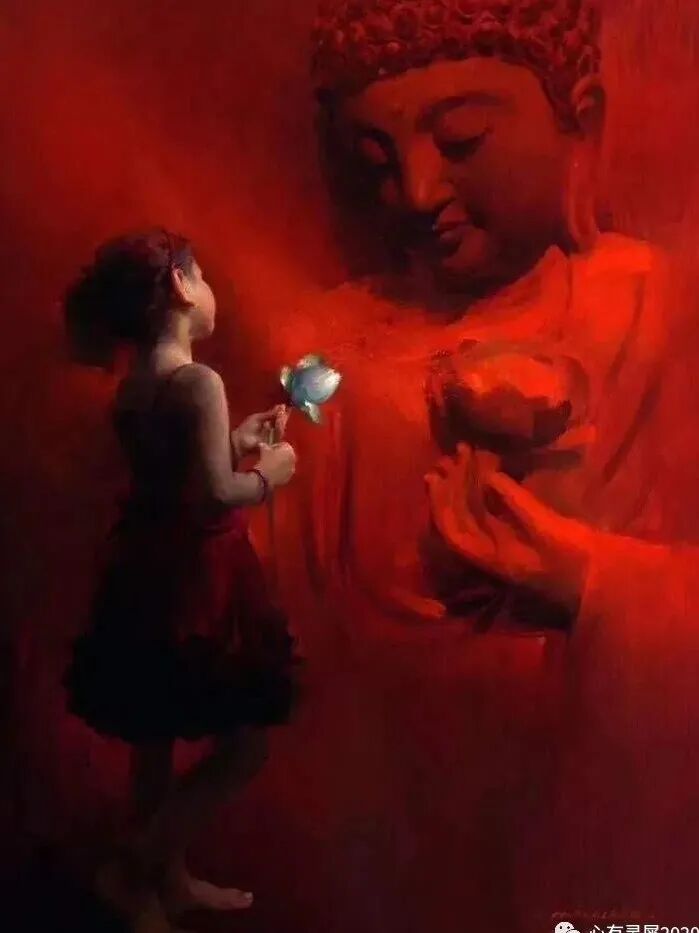 小女孩手捧白莲花,献给慈眉善目的佛祖,象征着心灵的纯洁无暇!