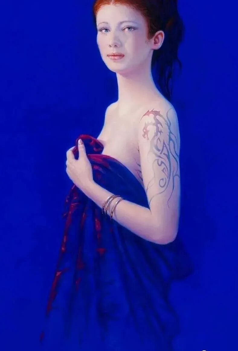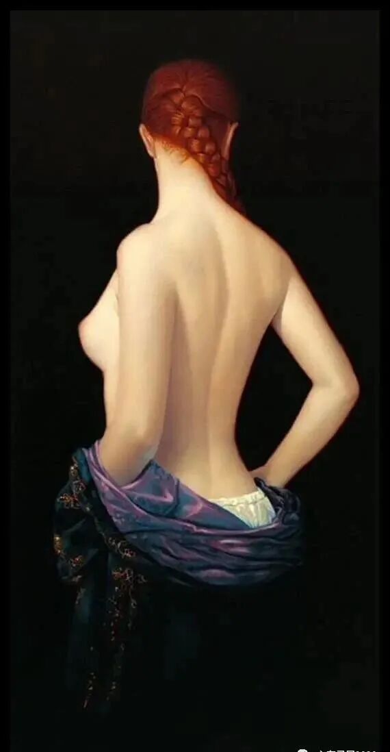 尤其这幅《裸背女人》的油画最迷人,画中这位裸背的红发女郎,其身姿可谓是凹凸有致,颇有惊艳之美。其实女人最美丽的是背部,还有就是颈项到背部、腰部、臂部的的曲线之美,虽然看不见面容,但这一转身,再加上双臂,犹如天使翱翔的翅膀!还有那条顺着颈部垂下的那条长辫子,一切都是那么的完美而令人陶醉。