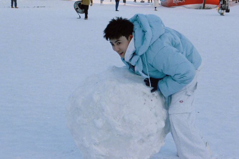 在大雪花摩天轮前,他迫不及待地要舔一舔冰雕,仿佛成为这个冰雪仙境中最快乐的一员。