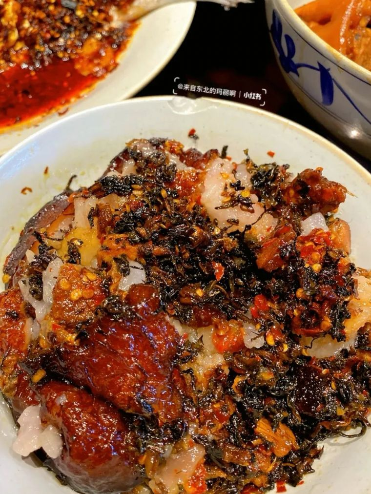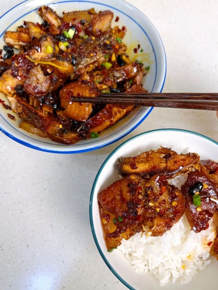一口腊肉,一口白米饭,口感柔韧,香味和豆豉渗入米粒,让人回味不已。