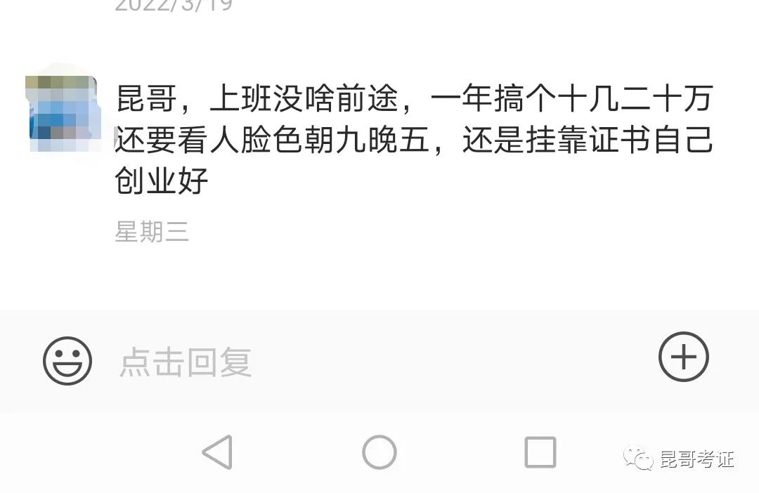 二是降低要求,找一份普通的工作,挣普通的工资,过普通的生活,除了工地当小工或者跑滴滴送外卖,很多相对稳定的行业证书就是敲门砖了。生活中的失败者也没必要灰心丧气怨天尤人,当社会抛弃了我们,证书可以让我们软着陆,至少能摔得不算太狼狈。