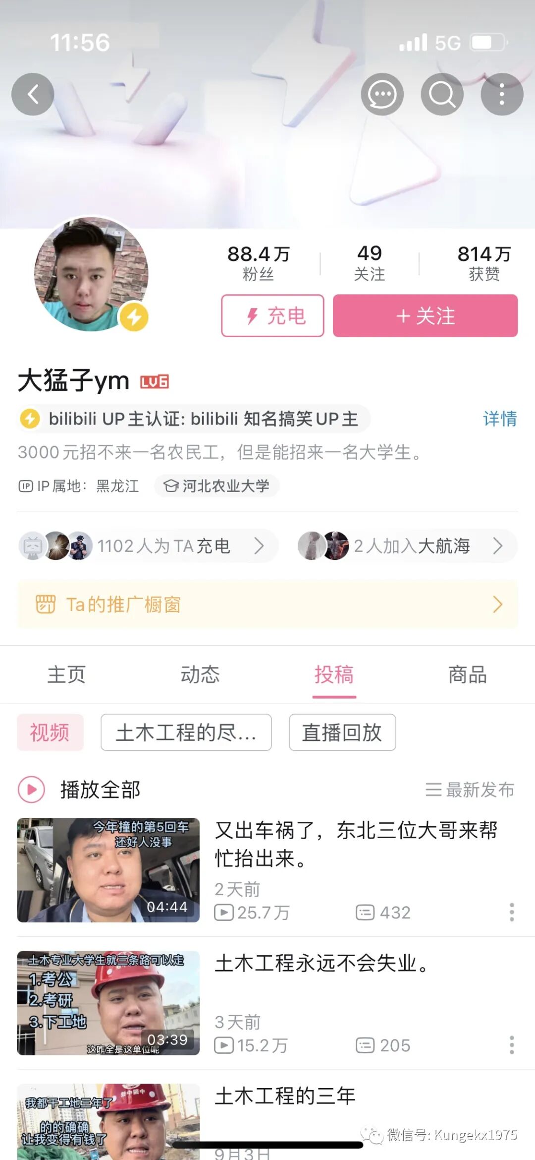关于大猛子,土木圈子里都不陌生,毕业三年的小伙子,在某站拥有近百万粉丝,视频每条近百万播放量,是职场自媒体头部网红大v。