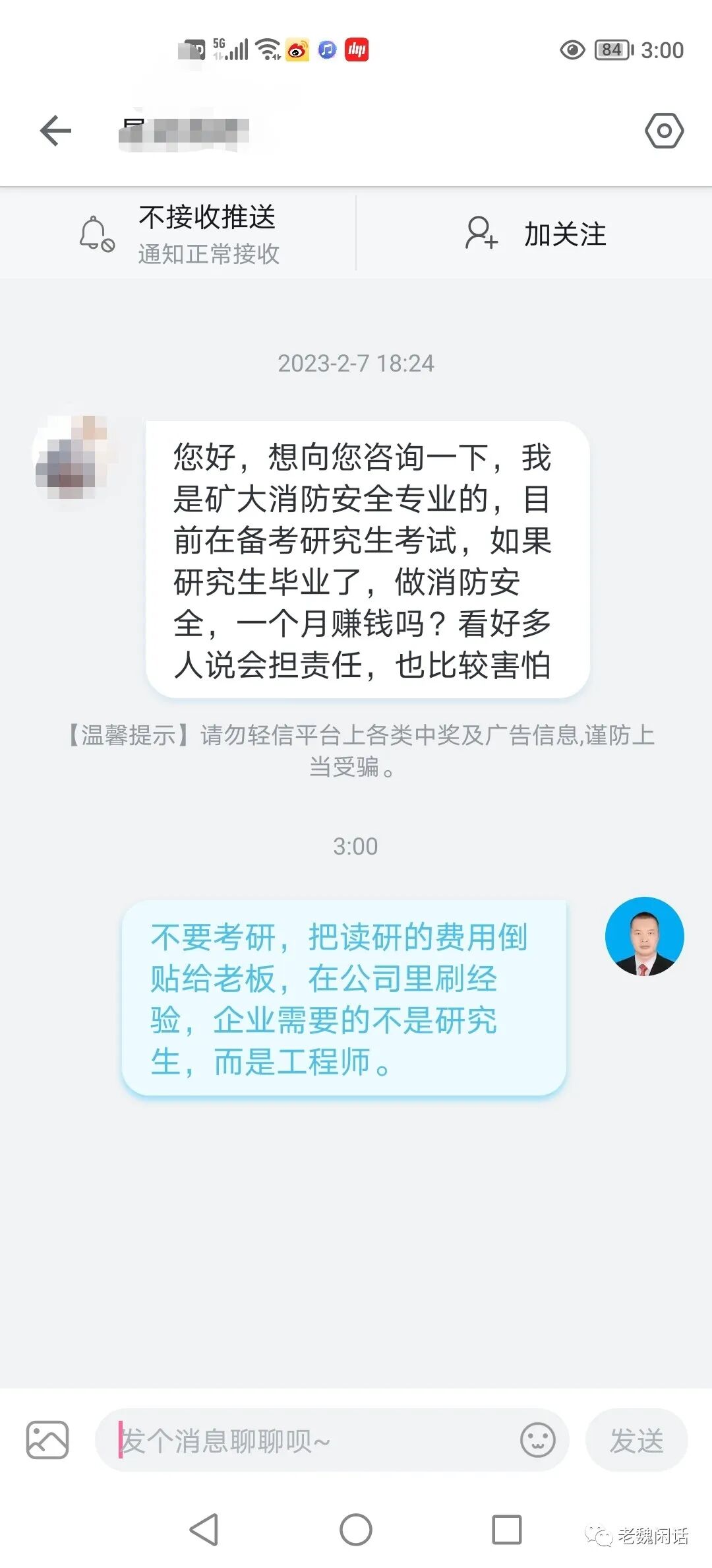 今天还有个同学说他是学消防专业的,在备考研究生,纠结干消防工资低,害怕担责任。