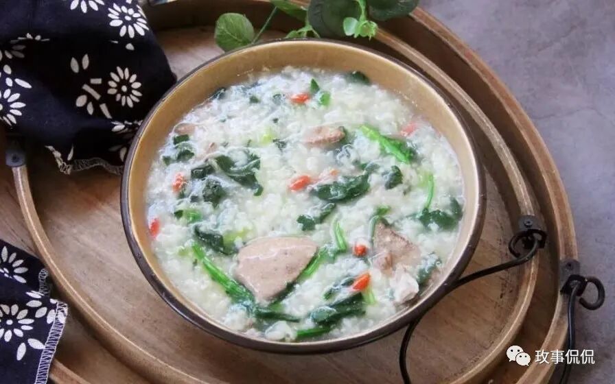 食材:猪肝50克、枸杞10克、大米100克。烹制:先把大米和枸杞放进粥锅煲到半熟的时候,把猪肝洗净切片,放入粥锅。然后用勺子轻轻地搅动几下,让猪肝可以划散开。接着熬煮到米烂了之后,就可以关火,吃了啦。