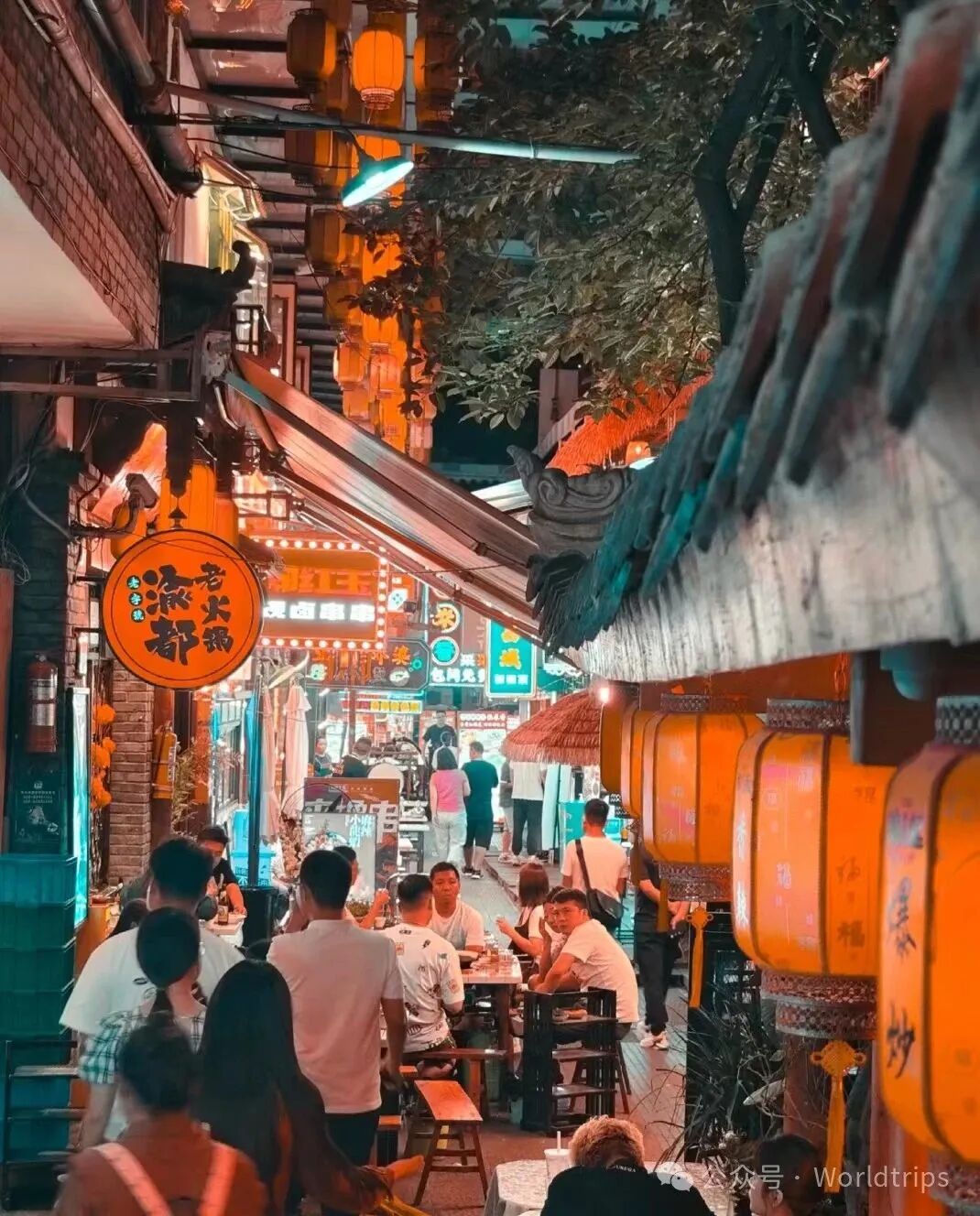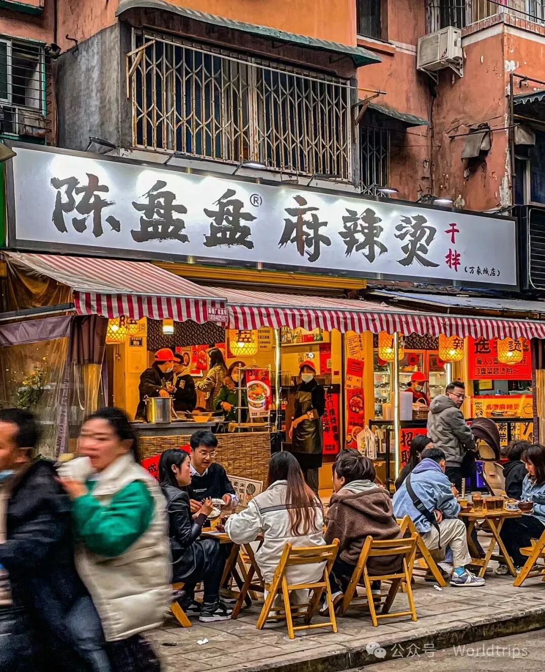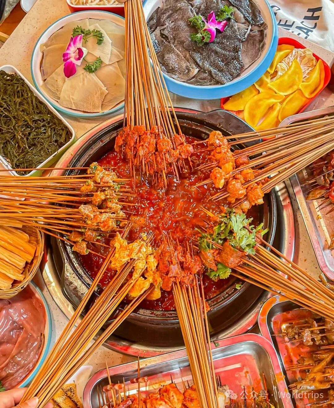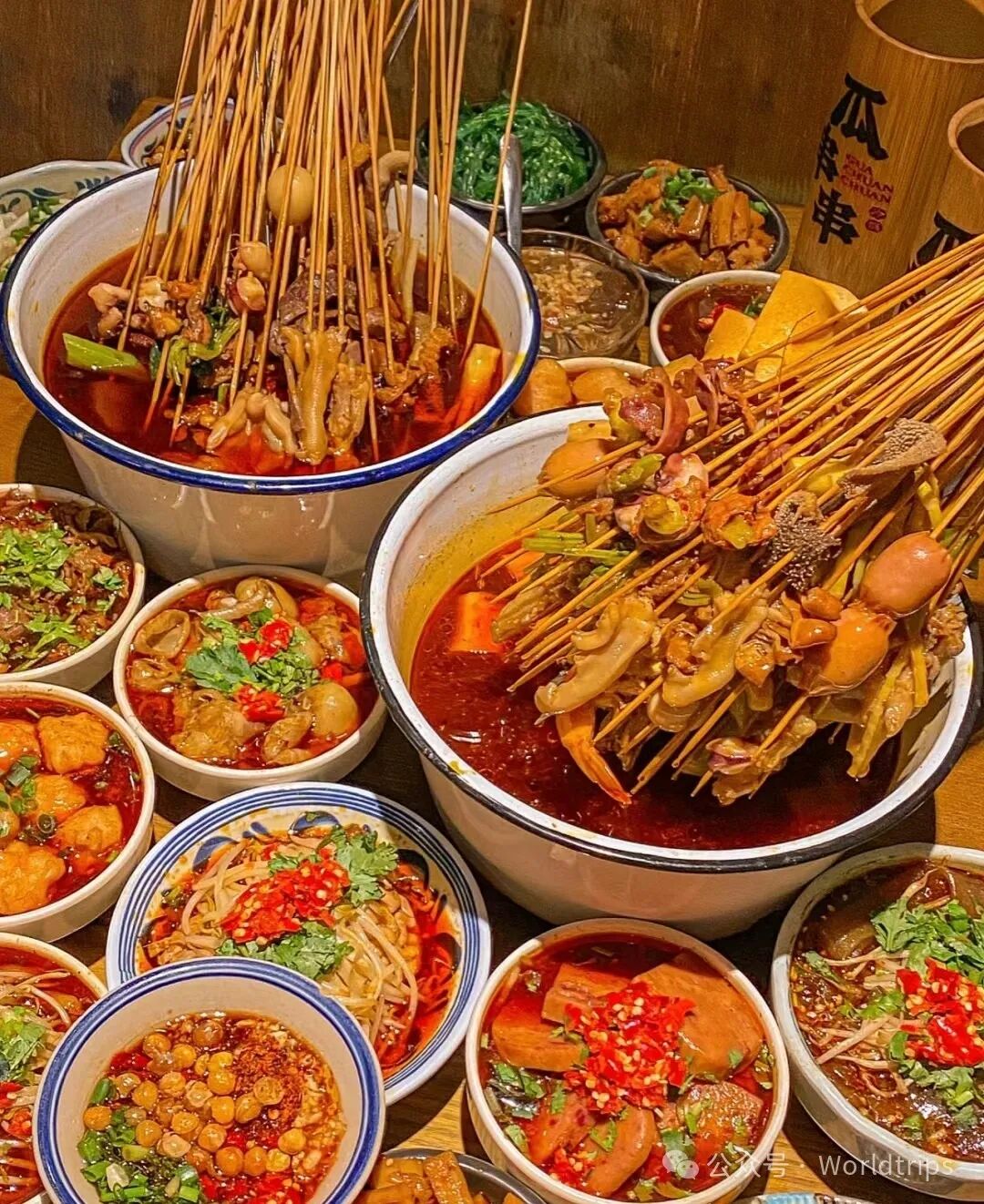 ❷串串香:串串香是成都街头巷尾常见的小吃之一。各种食材串在竹签上,在特制的汤底中煮熟,再蘸上各种调料,美味可口。