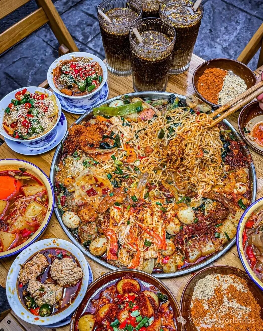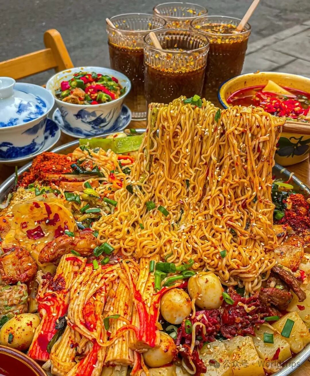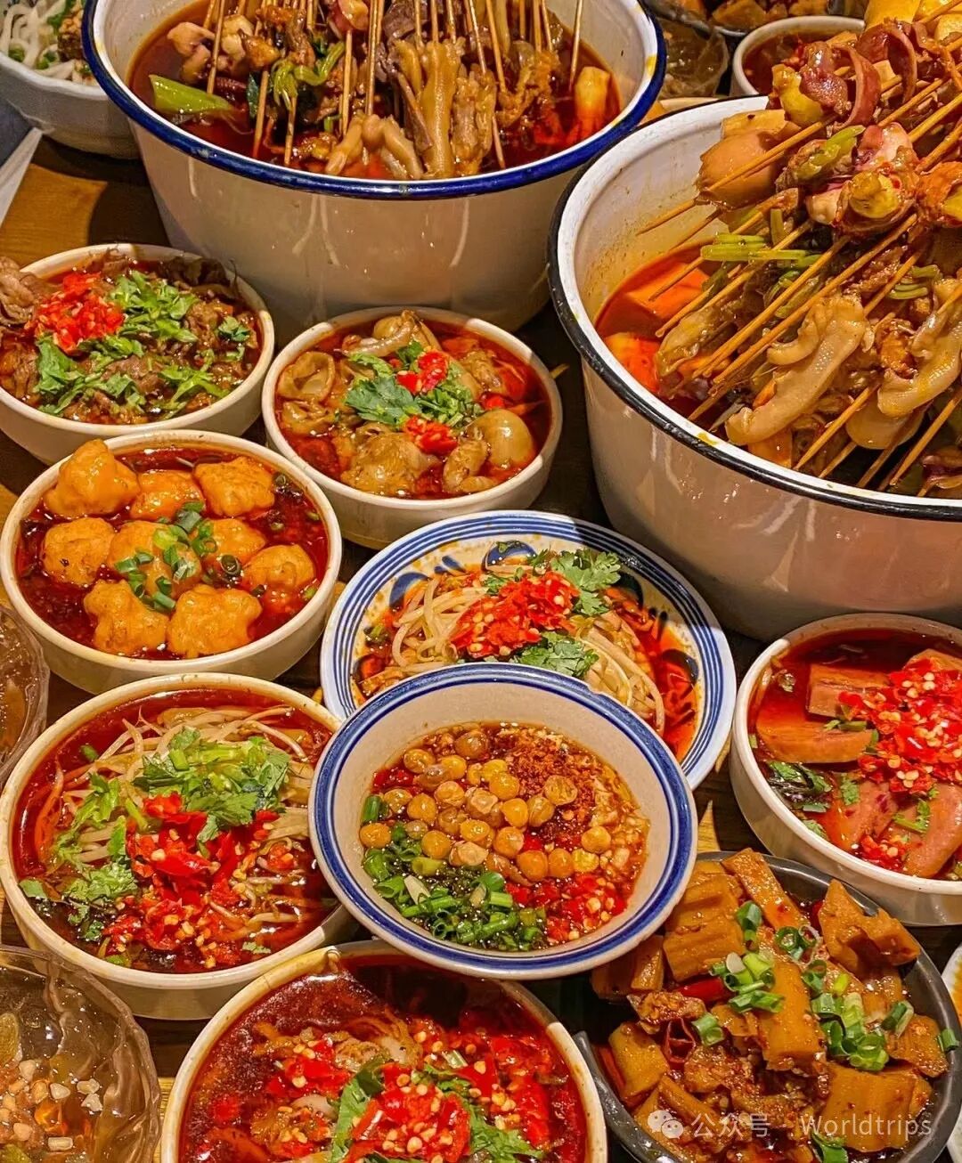 ❸麻辣烫:麻辣烫是成都人的最爱之一。它将各种食材放入滚烫的麻辣汤底中煮熟,再配以豆芽、豆腐等配料,口感丰富多样。