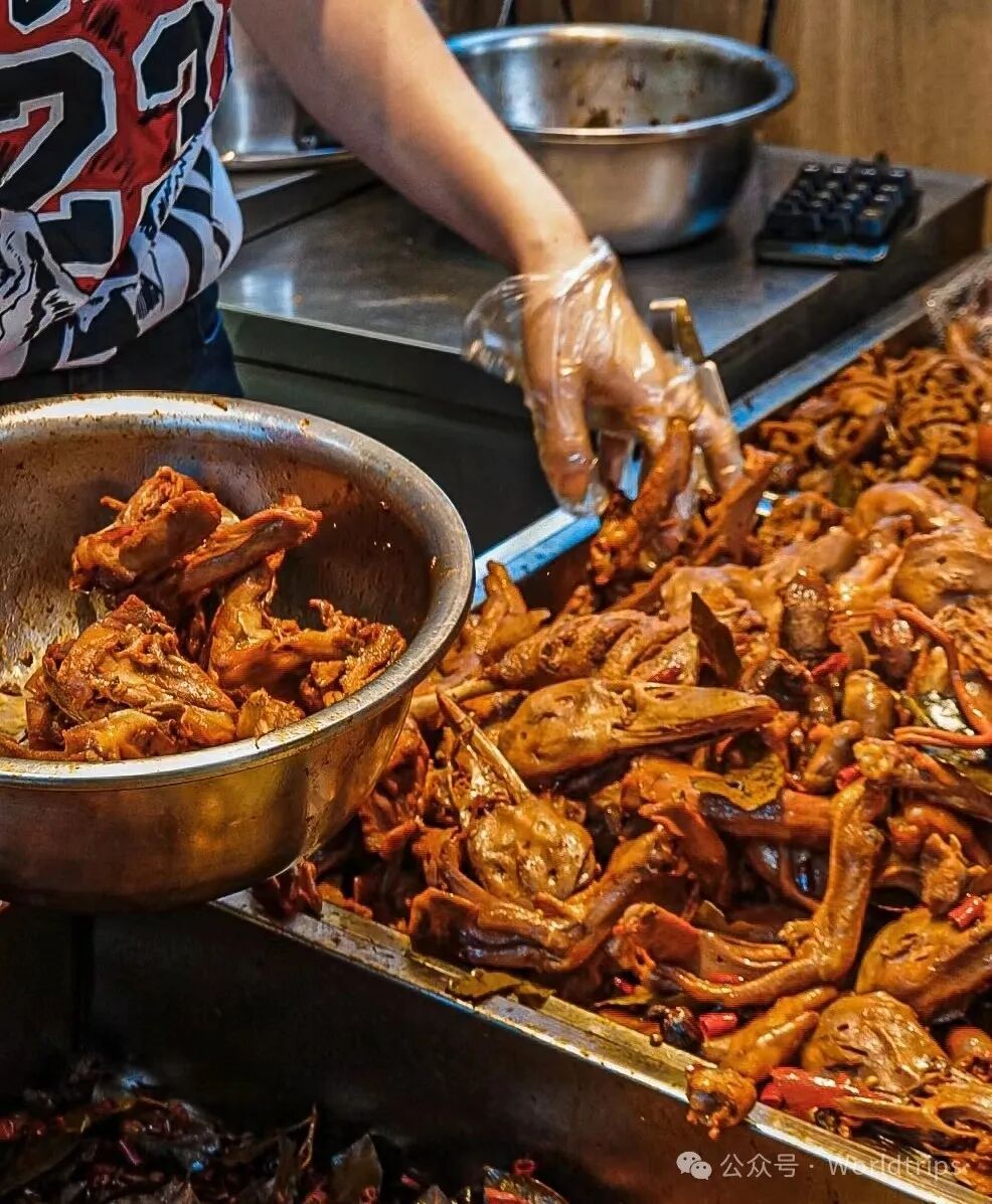 ❷鸭脖:武汉的鸭脖在全国乃至全世界都享有盛誉。烤制得恰到好处的鸭脖,皮脆肉嫩,麻辣可口,是夜宵的不二之选。