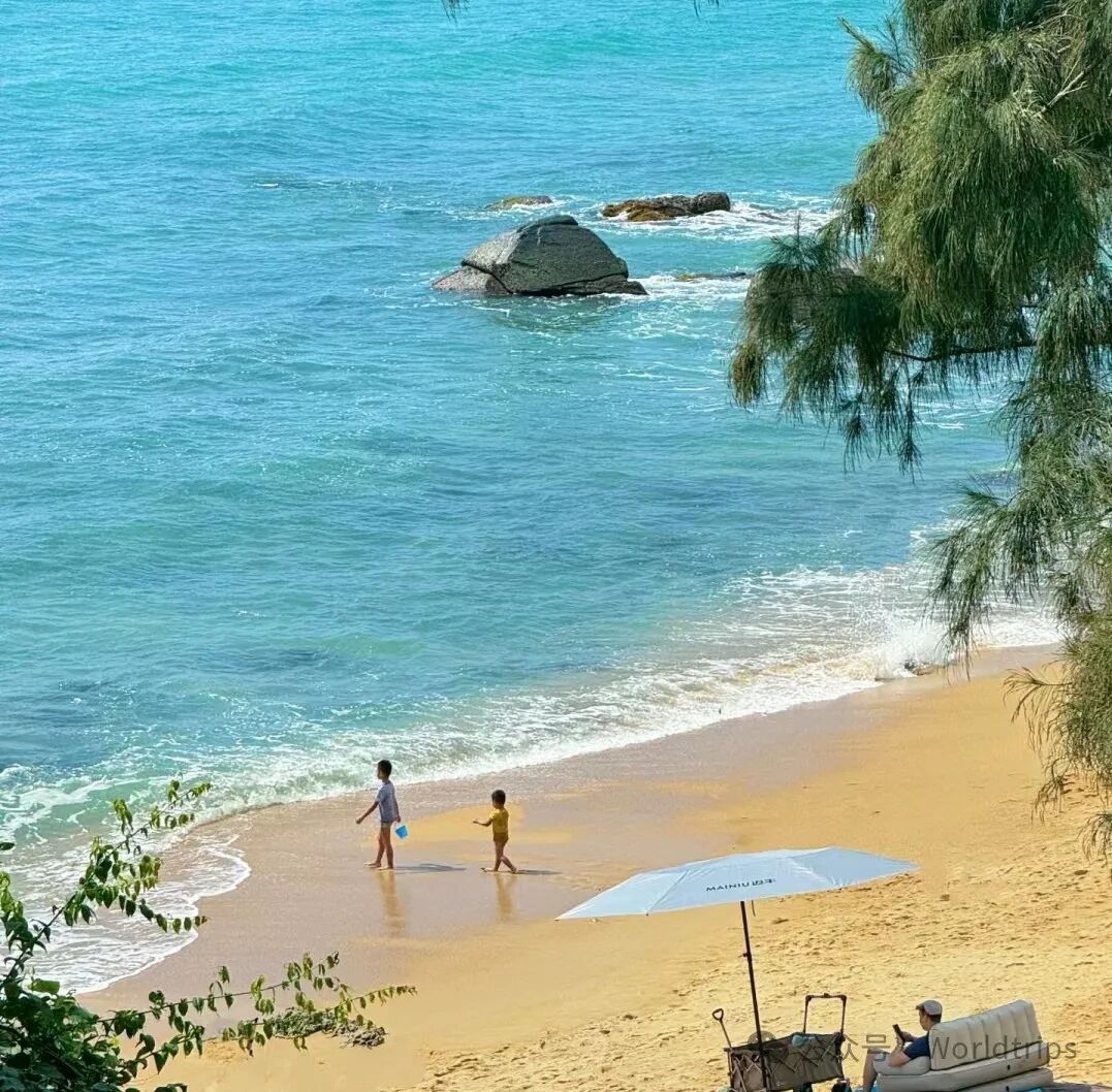 这里的海水清澈见底,沙滩细腻柔软,与三亚的亚龙湾、大东海等著名海滩相比,毫不逊色。