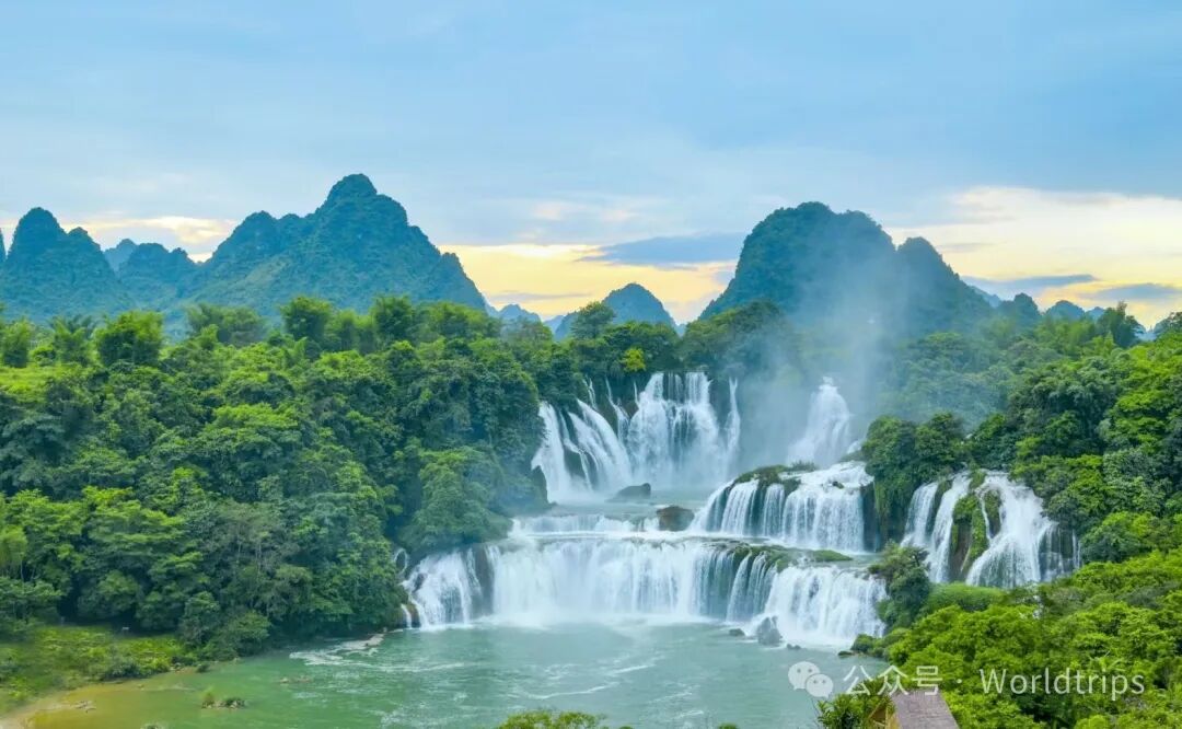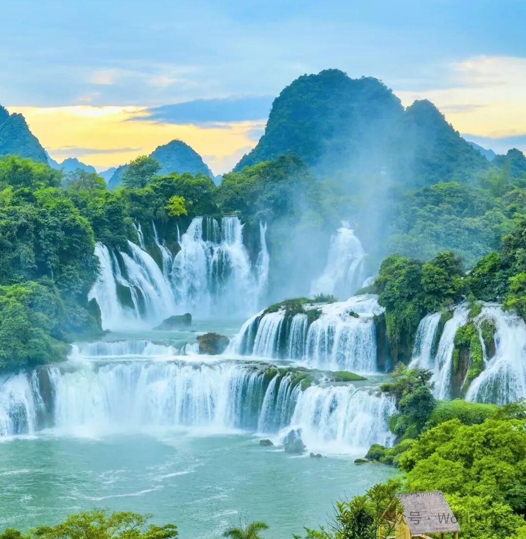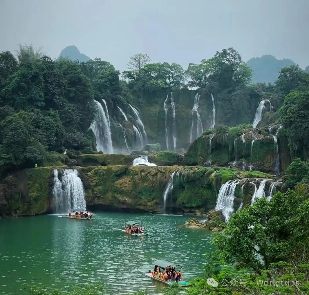 而在德天跨国瀑布前,壮阔的水流倾泻而下,中越两国的边界在此处交汇,展现着人与自然和谐共生的画面。