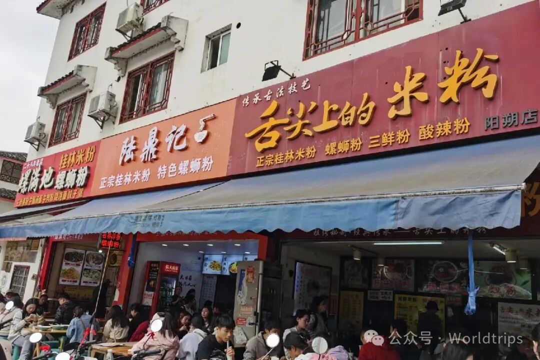 在阳朔西街,中外游客汇聚一堂,共同品味当地特色的美食与文化;