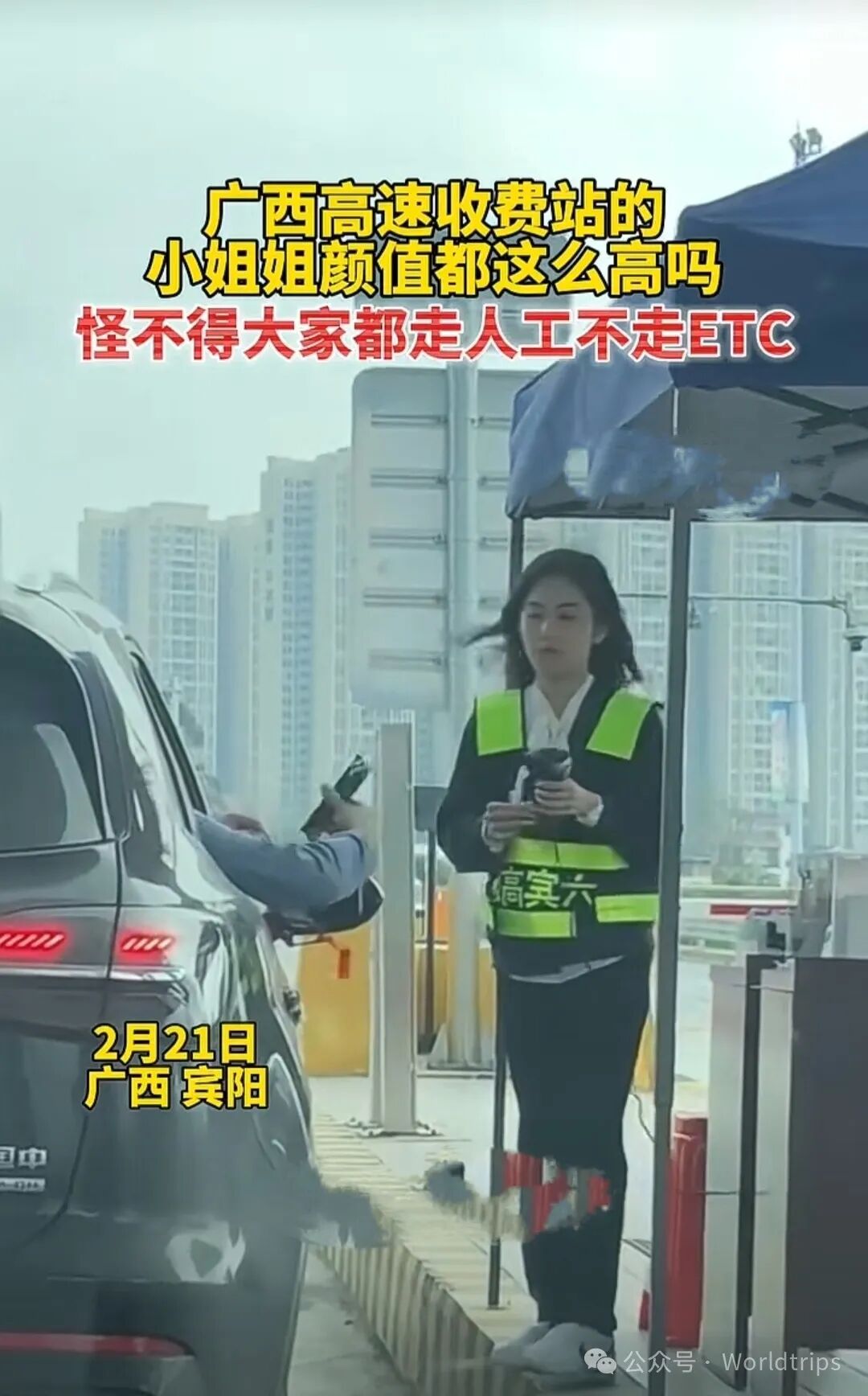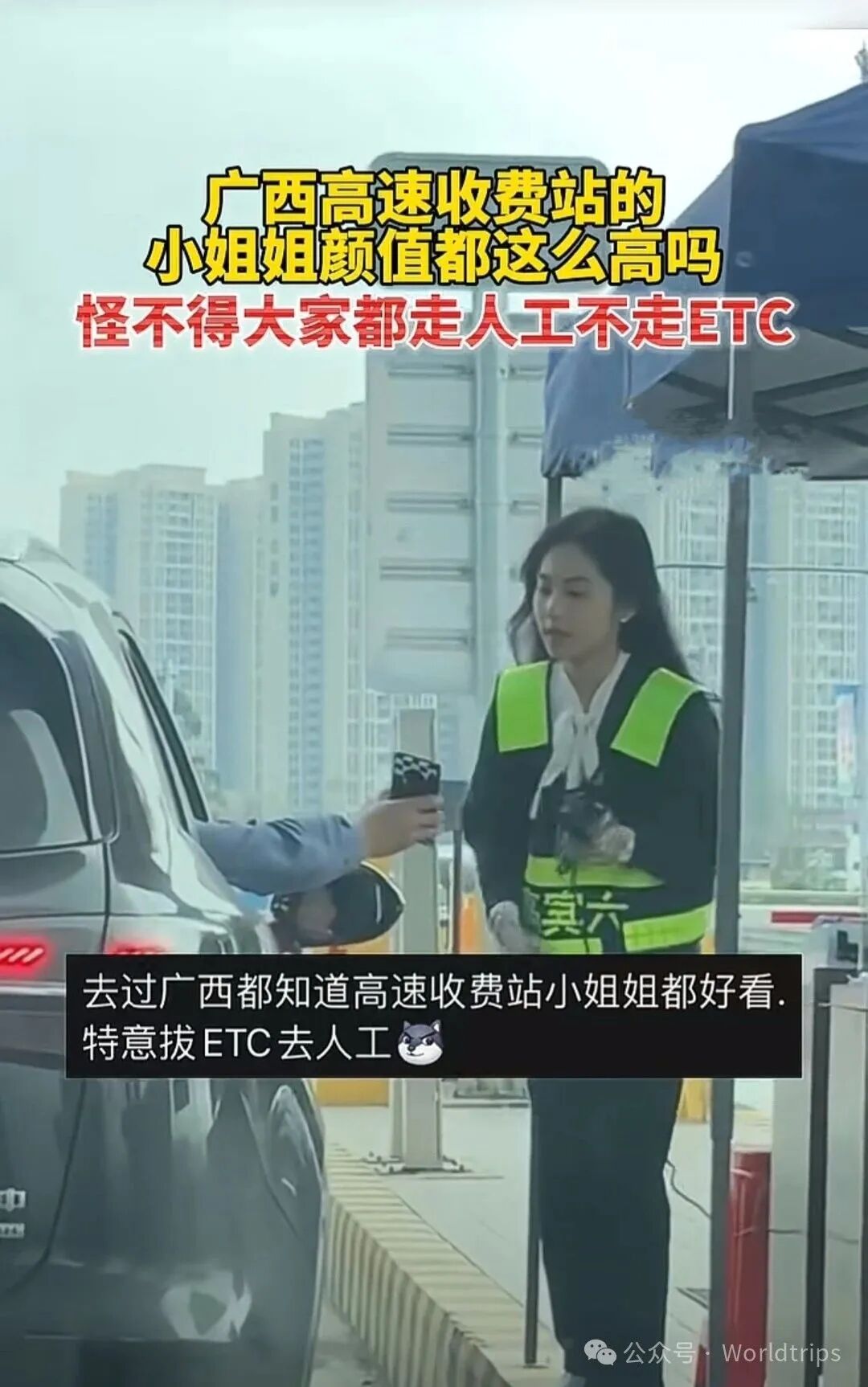 那就是在网络爆红的广西某高速收费站邂逅的那位微笑天使——收费站小姐姐。