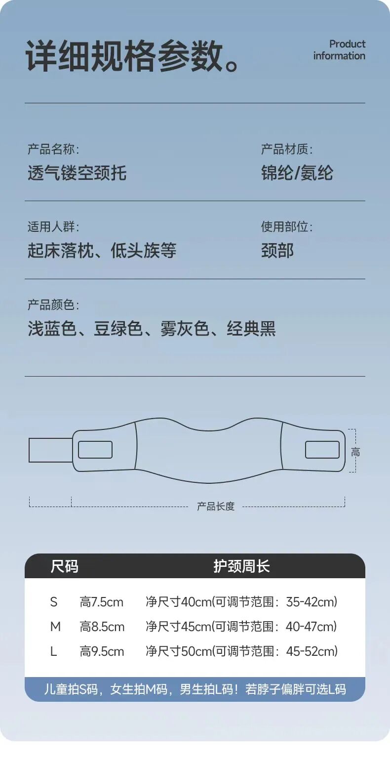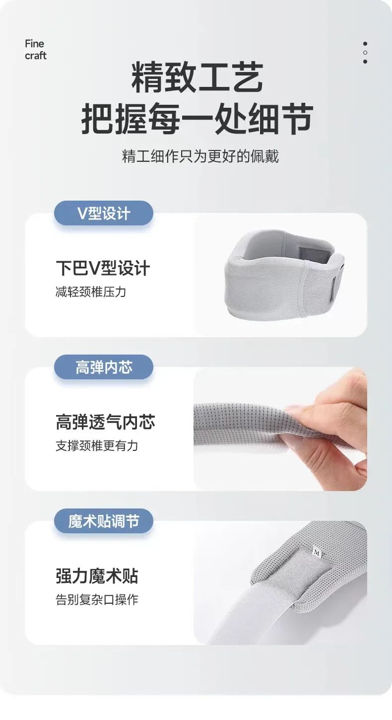 这款颈托根据人体工学弧形设计,前面支撑下巴,后侧牵引,符合颈椎生理曲度,贴合颈椎,侧面加高,承托住头部重量,360度,给头部一股“托举之力”。