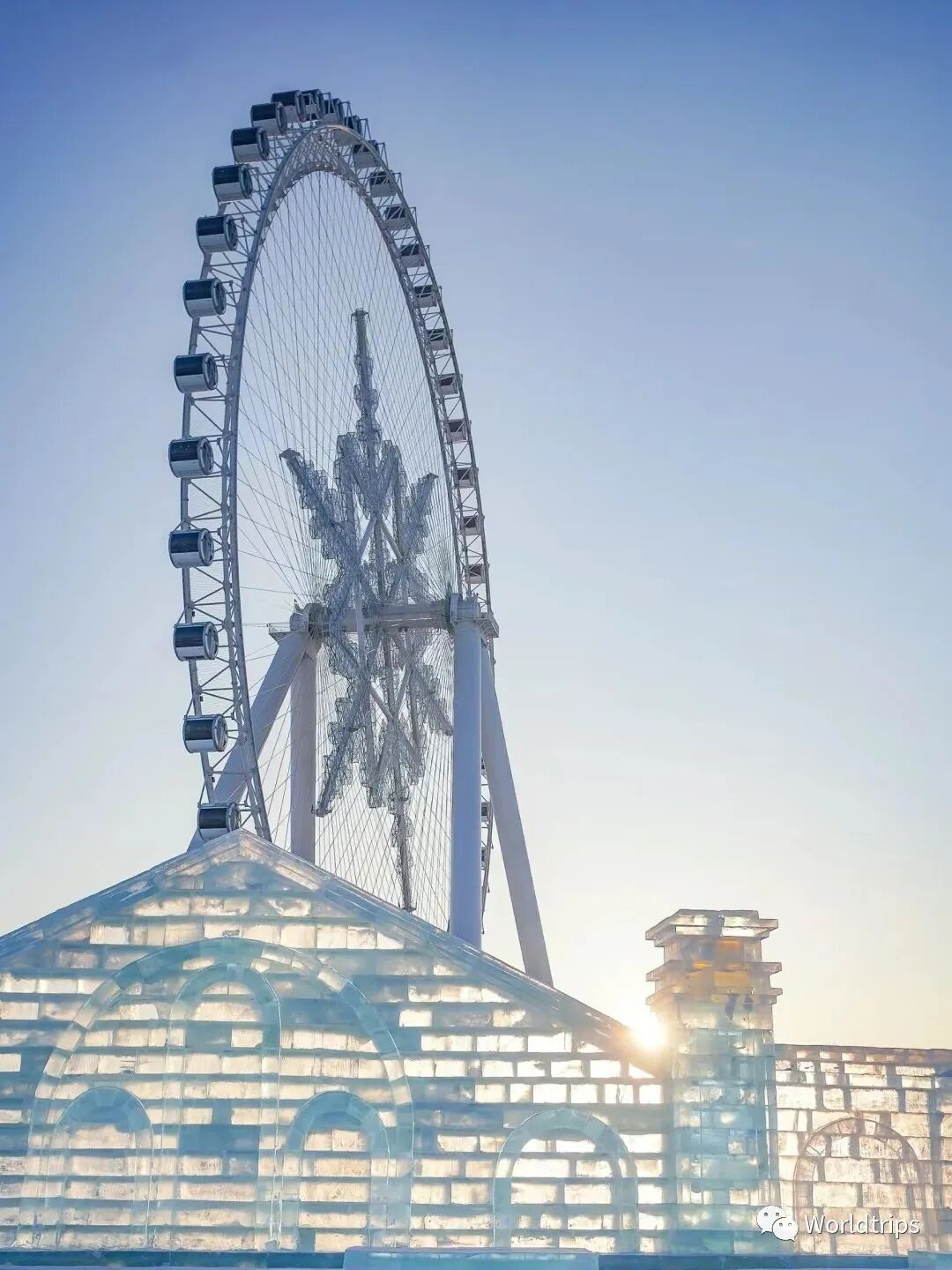 而除了冰雕之外,这里还有一项令人叹为观止的建筑——高120米的巨型雪花摩天轮。当你乘坐摩天轮转到最高点时,不仅可以俯瞰整个冰雪大世界的壮丽景色,还能饱览松花江的冬日风光。想象一下,在这样一个美轮美奂的环境中欣赏风景,该是多么惬意的一件事啊!