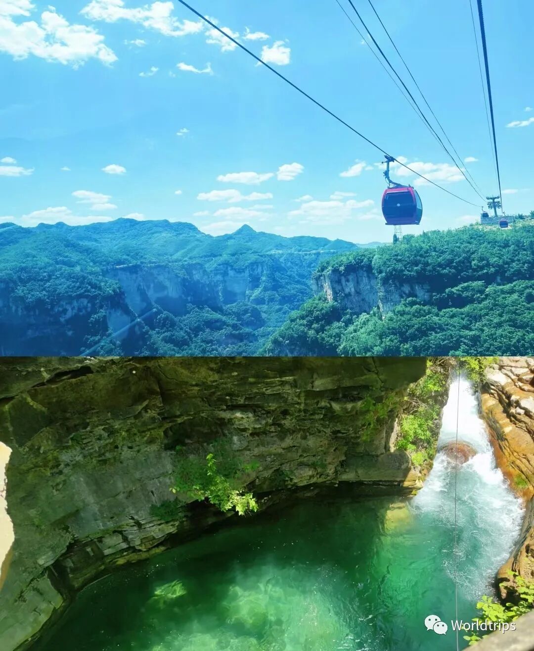 一路上,你会遇到飞瀑流泉、水彩画般的景色。而最让人期待的莫过于那条会拐弯的索道。乘坐索道翻越13个山头,只需25分钟左右。在这短暂的旅程中,你可以360度感受巍巍太行的壮丽景色。仿佛整个世界都在你的脚下,让你感受到了大自然的伟大与辽阔。