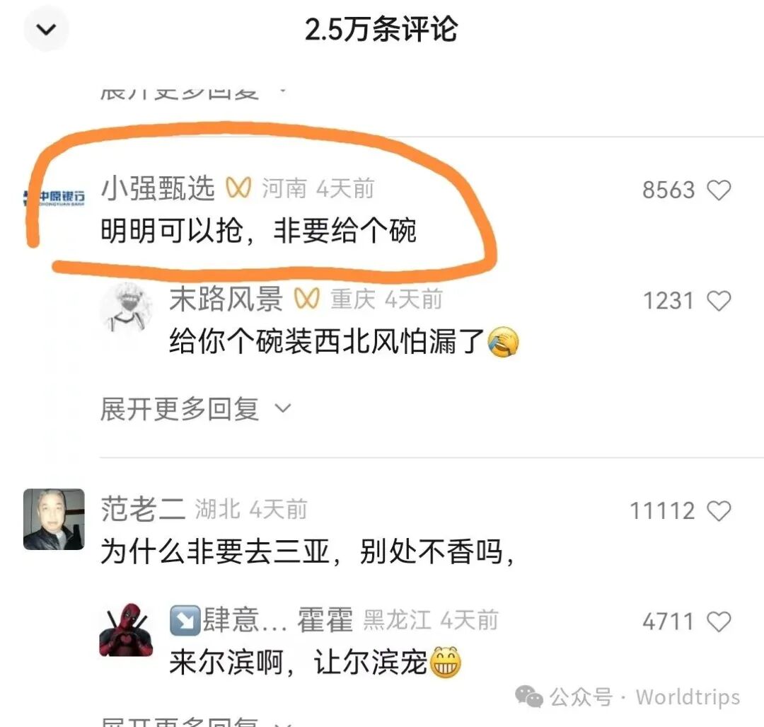据报道,有游客携孩子在三亚某景区餐馆购买了一碗油泼面,然而,面对高昂的价格和并不足以让孩子吃饱的份量,该游客感到失望并在网络上分享了这一经历。一时间,“50元一碗的油泼面”成为舆论焦点,评论区网友纷纷以“明明可以抢却偏要给个碗”的调侃表达关切。