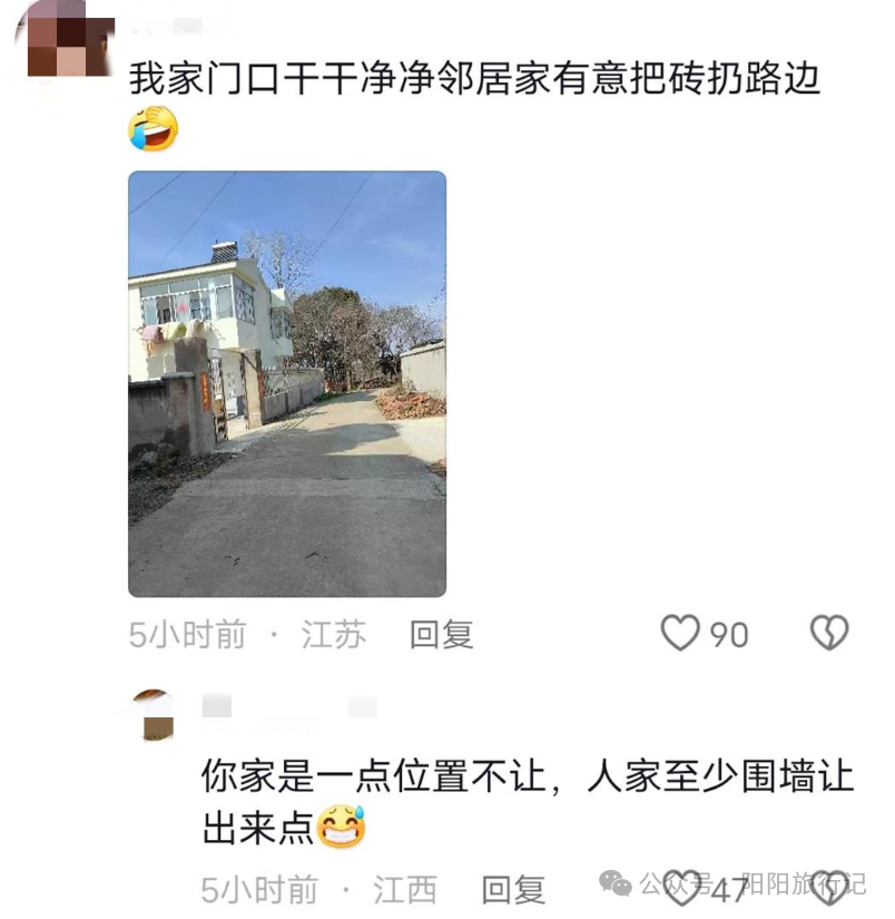 令人惊讶的是,在评论中还涌现出了一个女子的吐槽。她抱怨邻居对门口堆砌砖头,占据了通道的空间。
