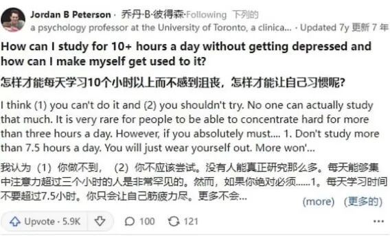 乔丹·彼得森教授在下面回复道:“第一你做不到,第二你也不应该尝试。没有人能够学这么长时间。很少有人能够集中精力超过三小时以上。”。