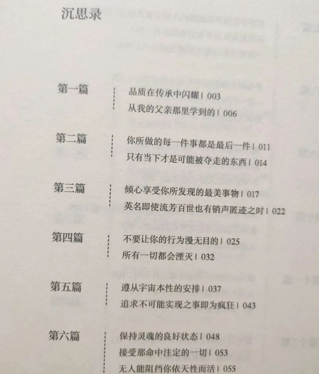 《沉思录》主要从个人提升、对社会的关系这些角度来思考,以达到内心的通透,摒弃一切无用和琐屑的思想,从而正直地思考。