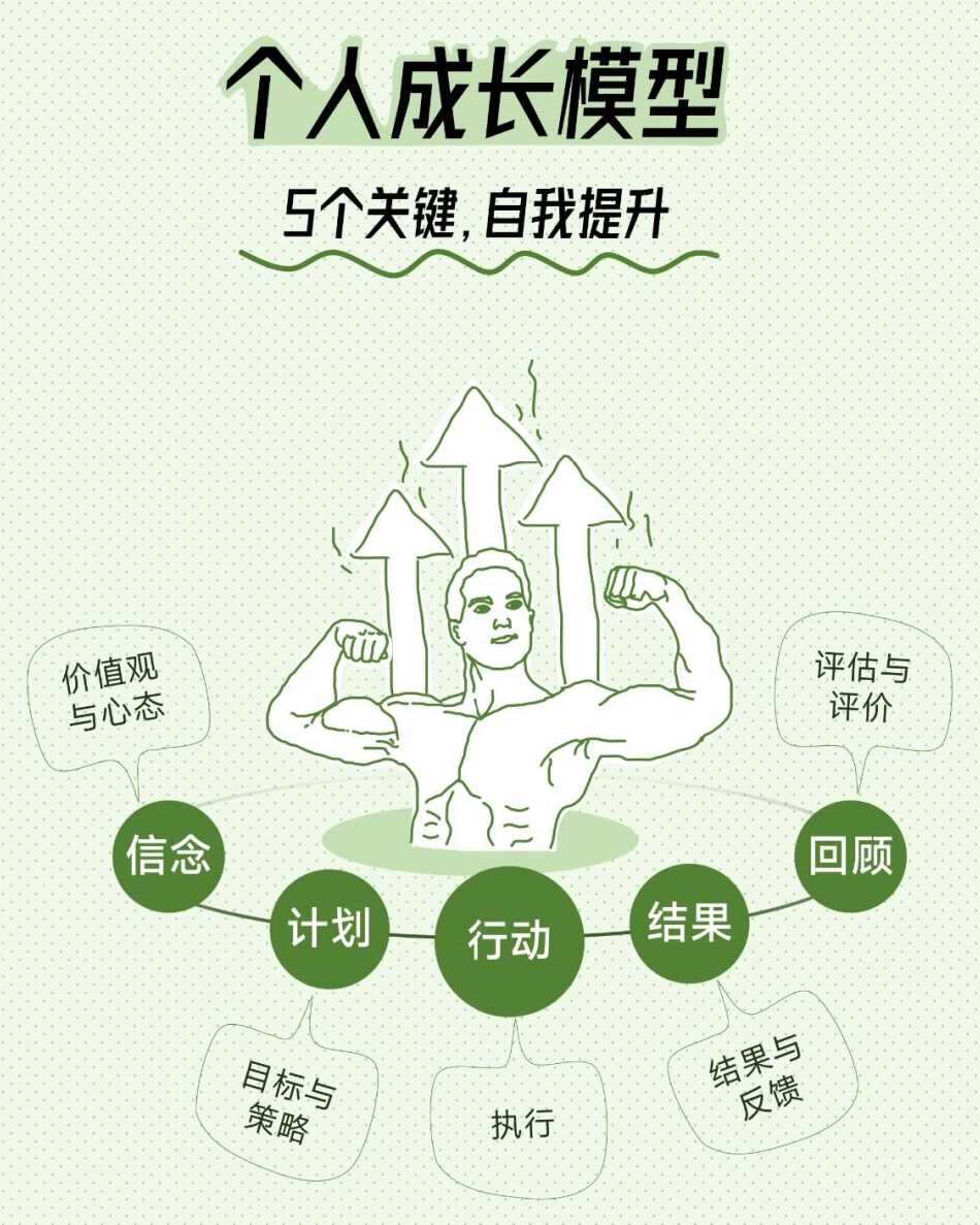个人成长模型描述了个人能力提升和自我发展的5个重要步骤,包括了信念、计划、行动、结果和回顾,实际上它是一个循环式的成长圈。