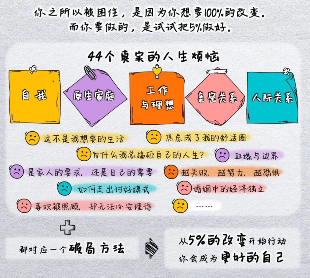 💡北京大学心理学博士李松蔚对44个真实的人生烦恼进行反馈引导和破局复盘,总结出:你之所以被困住,是因为你想要百分百的改变;而你要做的,是试试把5%做好,足以改变生活。