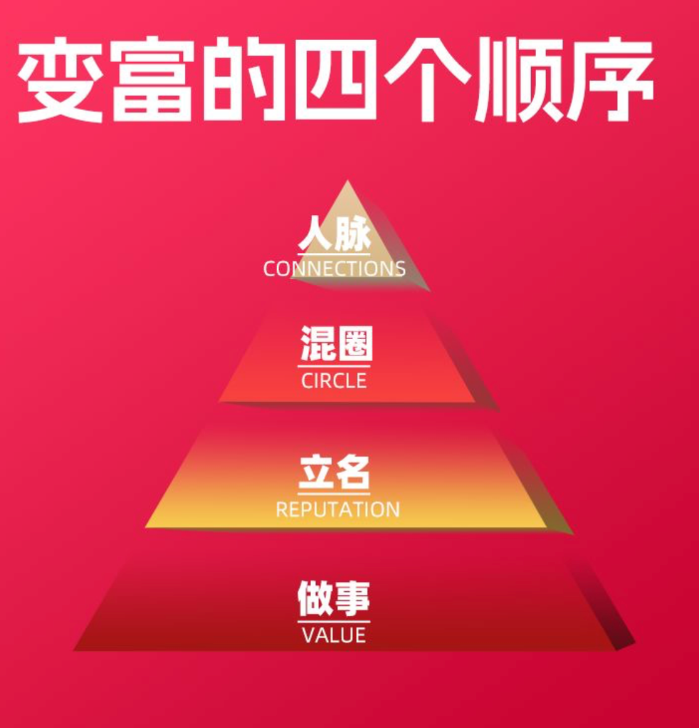 朋友们,记住,变富的顺序是不能搞反的!先做事,成为领域专家,然后立名,让人们知道你的专业能力,接着混圈,尝试与更多志同道合的人进行交流,最后扩大你的人脉关系网,找到真正可以帮助你的人。