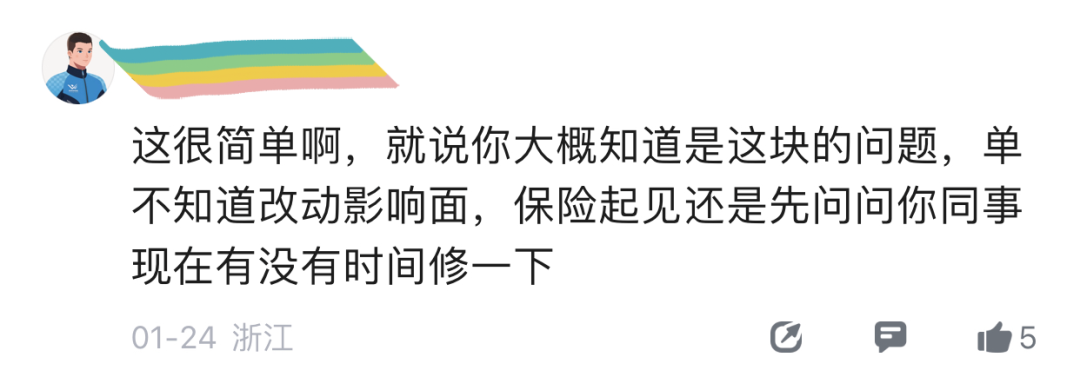 网友们最后也是在线支招:就说你大概知道是这块的问题,但不知道改动影响面,保险起见还是先问问同事有没有时间修一下。