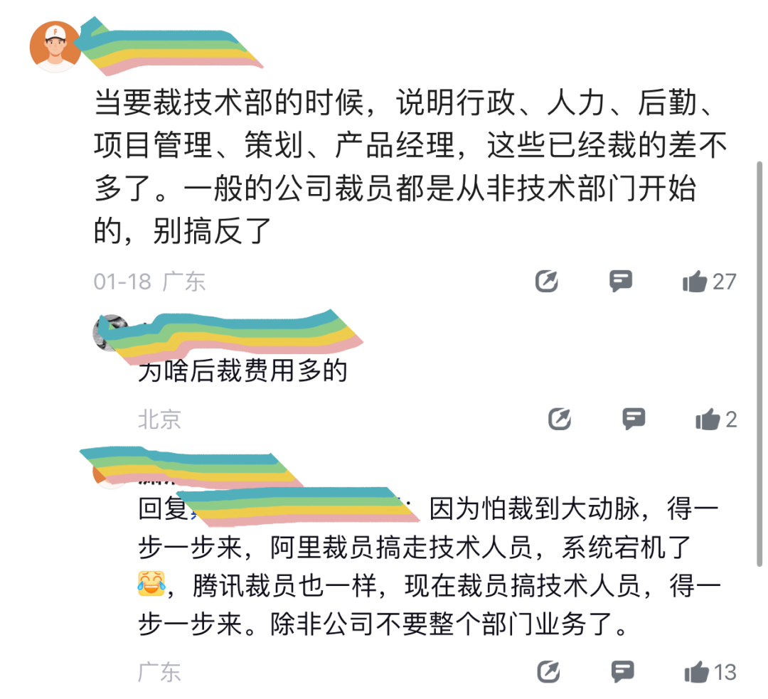 比如这位明显是来自非技术部门的网友说道:当要裁技术部的时候,说明行政、人力、后勤、项目管理、策划、产品经理,这些已经裁的差不多了。一般的公司裁员都是从非技术部门开始的,别搞反了!