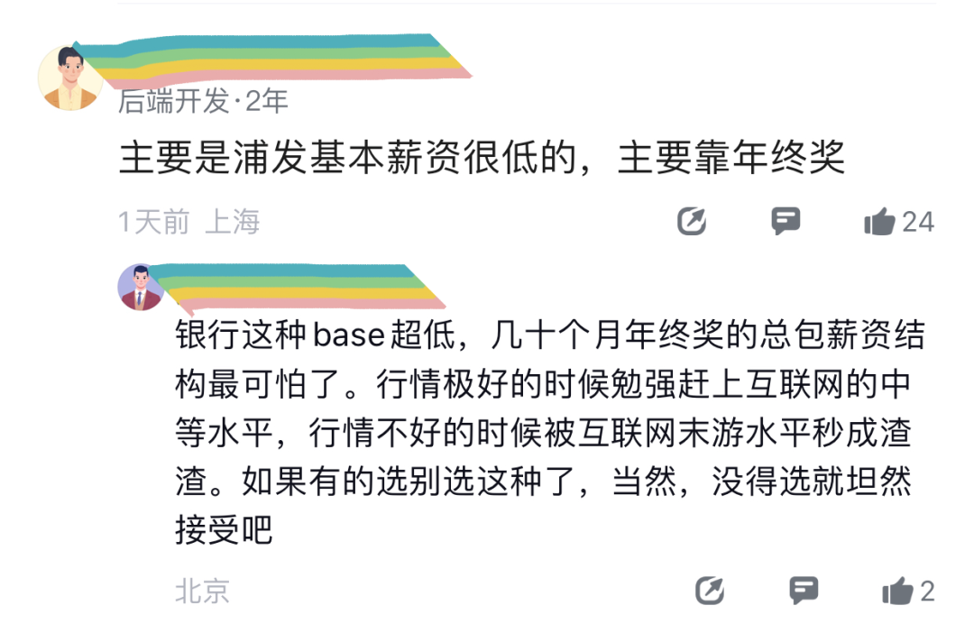 又一位网友对浦发银行的薪资结构作解释:基本薪资很低的,收入主要靠年终奖。