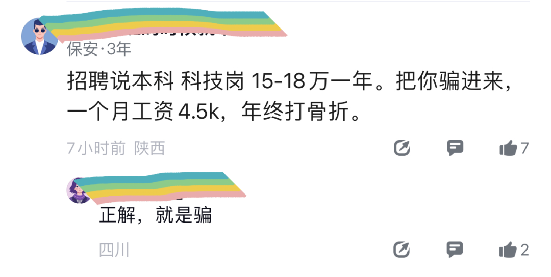 这位大哥说得更直接:招聘说本科科技岗是 15-18万一年,进来之后月薪4500,全指着年终来补齐,结果年终给来个骨折,这不是骗是什么?