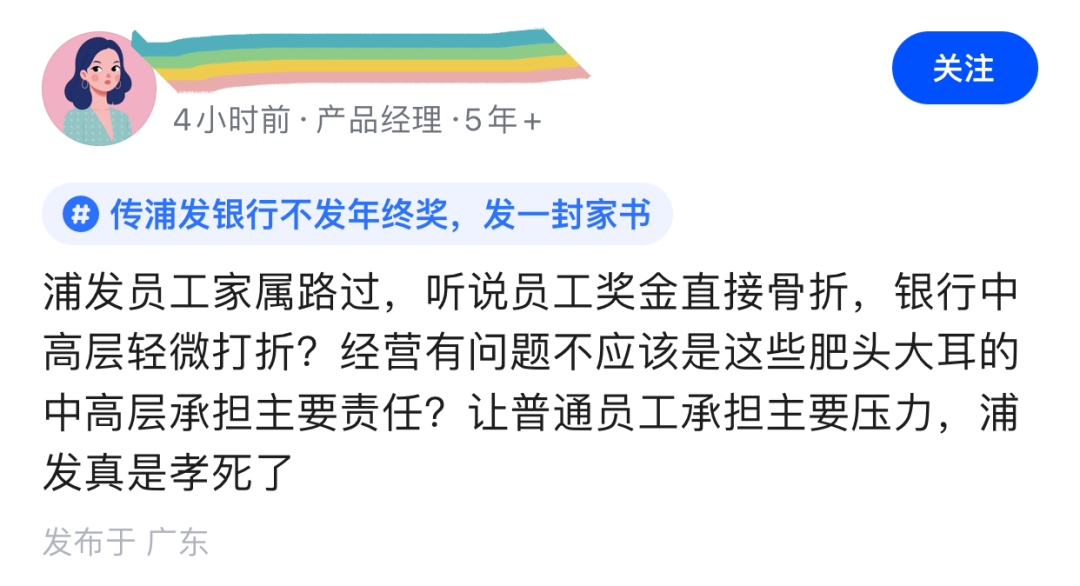 来自浦发员工家属则表示,听说员工奖金直接骨折,中高层轻微打折?即使经营有问题,不应该是这些“肥头大耳”的中高层承担主要责任?让普通员工承担主要压力,浦发真的是“孝死了”。