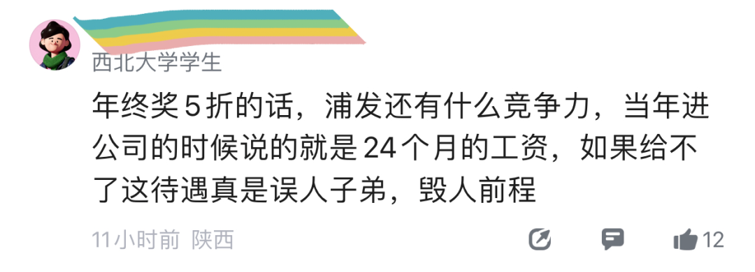 注意看这位网友的爆料:当年进公司的时候说的是发24个月的工资,年终奖5折的话,相当于最初的承诺打水漂,完全没有竞争力,往严重说就是误人子弟、毁人前程。
