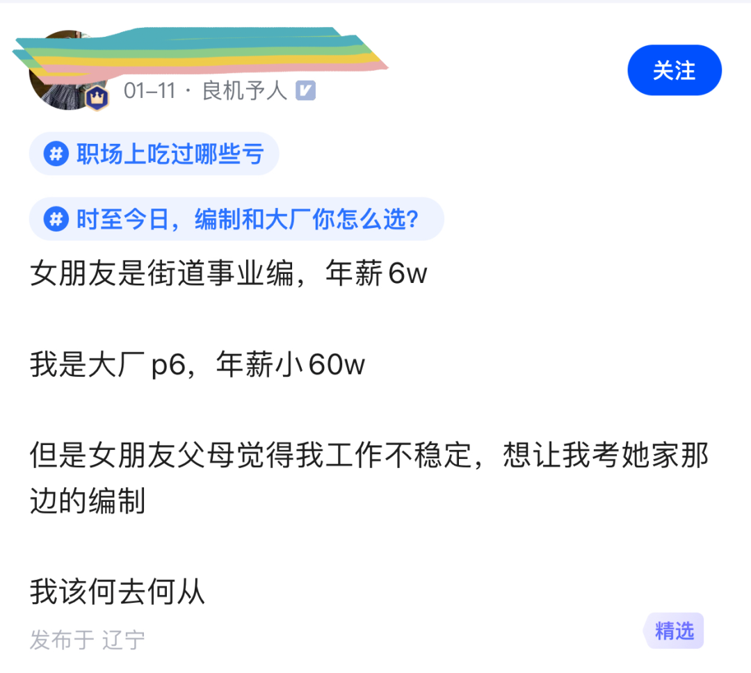 有网友就发现自己站在了十字路口:女朋友是街道事业编,年薪6万;我是大厂p6,年薪小60万,但是女朋友父母觉得我工作不稳定,想让我考她家那边的编制,我该何去何从?