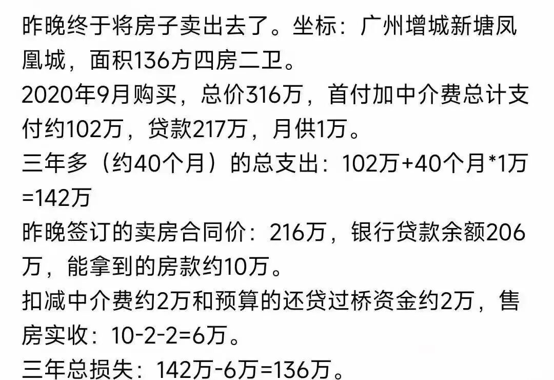 朋友2020年在广州增城316万买了套房,昨晚210万卖出去了,血赚-136万。