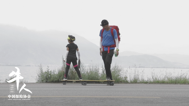 滑行之路并不顺利,骑行乌兰巴托时,有父亲在前面遮风挡雨,绕洱海滑行却需要自己前进。练习时间短,加上年纪小体力不足,第一天上路,朵朵就摔倒了好几次。