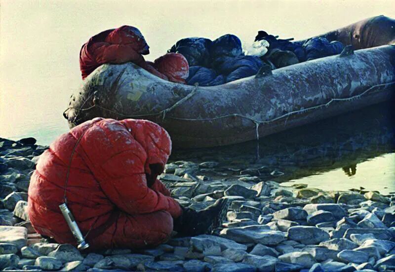 没有岸的地方,就在湖上扎营过夜,睡在冰天雪地里。他们还遭遇过一次暴雨,简单搭了个顶,下半身就在船里泡着,冻得全身除了眼珠子,其他部位都动不了。