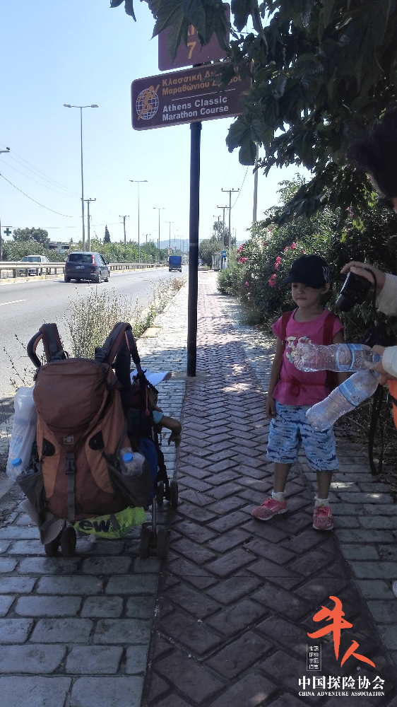 背着帐篷、背包、带足水,罗艺夫妇带着女儿,推着不到2岁的小儿子,在烈日下走了3天,小罗在全程自己走完42.195 公里,一步没少。