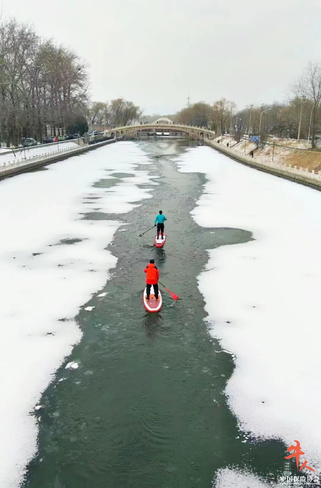 昆玉河有的河段冬天同样会结冰。田思维和同伴们就用桨板去破冰,或者在做好安全保护措施的前提下,到冰上蹦,把冰面给扎个窟窿,再拿着桨板往前推进。一群人愣是在结冰的河面给开出一条道。